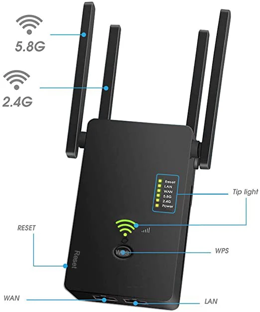1.1200mbps WiFi Repeater has 4 pcs external antennas to improve existing network signal strength, extend wireless signal to hard to reach areas with 802.11 technology. 2. AP Router Support Dual Band WiFi (2.4ghz + 5ghz), it offers combined baud rate up to 1200mbps. Web surfing or video chat, the online video player can easily handle. 3. One-key wps encryption, or browser-based configuration, accessible to almost all wireless devices. maximum security wlan 4. with wpa2, wpa. Smart led signal indicator helps you find the best spot. 5. Complies with standard ieee 802.11a//n/g/b, wan/lan, lan (10/100) port available to connect wired devices. 6. Supports wired access point repeater and repeater wireless connection modes, compatible with most routers.