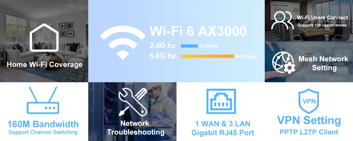 Supports the 802.11AX protocol, providing wireless access speeds of 573.5Mbps in 2.4GHz and 2402Mbps in 5GHz, with a total wireless access speed of 3000Mbps.
