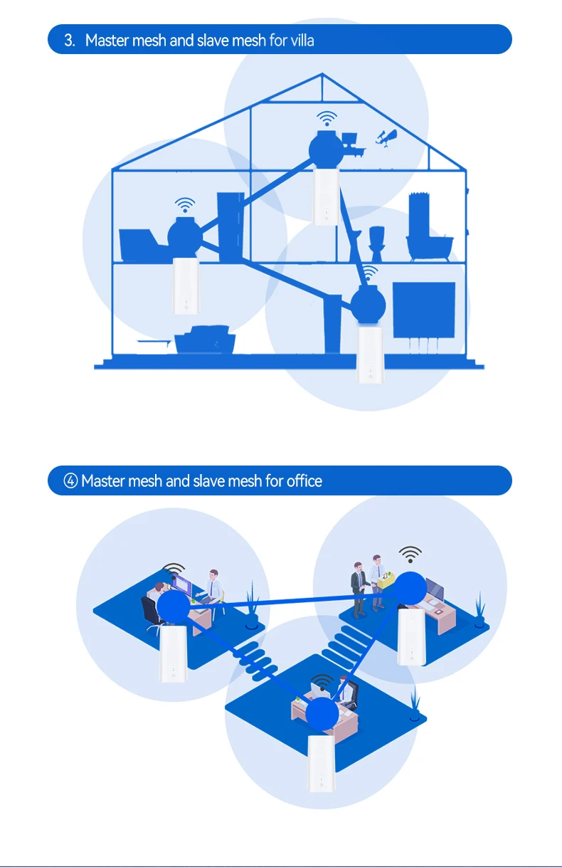Whole house WiFi coverage with faster and more stable WiFi mesh network, get rid of WiFi dead zones. Built-in signal enhancement module and provides up to 1200sq.ft.