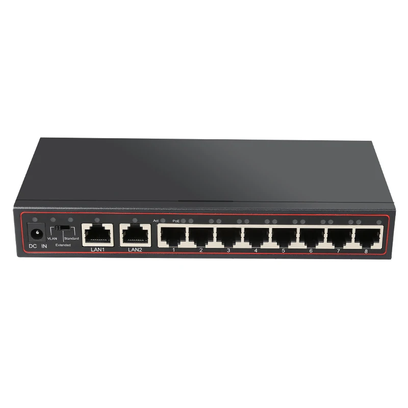 1.Ten 10/100Mbps Power Over Ethernet Ports 2.1-10 Port: 10/100M auto sensing RJ45 port 3.Max. 30W for each PSE/PoE Port (Port 1~8) 4.Support long transmission distance at 250 meters 5.Switch Mode: a.Mode 1(Standard): Port 1~10: 10/100M auto-sensing @ 100 meters b.Mode 2(Extend): Port 1~8: 10M @ 250 meters; Port 9~10: 100M @ 100 meters c.Mode 3(VLAN): Port 1~8: 100M @ 100 meters; Port 9~10: 100M @ 100 meters; Ports 6. 1 to 8 will be isolated from each other, but will still be able to communicate with uplink port 9 and 10. 7. Auto-detect full/half-duplex, MDI/MDI-X 8. IEEE 802.3x flow control for full-duplex and back-pressure flow control for half-duplex 9.Industry Standards IEEE 802.3af/at, IEEE 802.3, IEEE 802.3u, IEEE Power Source DC Adapter Included Environmental Humidity 20~80% RH Operating Temperature 5°C to 50°C (41°F to 122°F) Storage Temperature -25°C to 70°C (-13°F to 158°F)