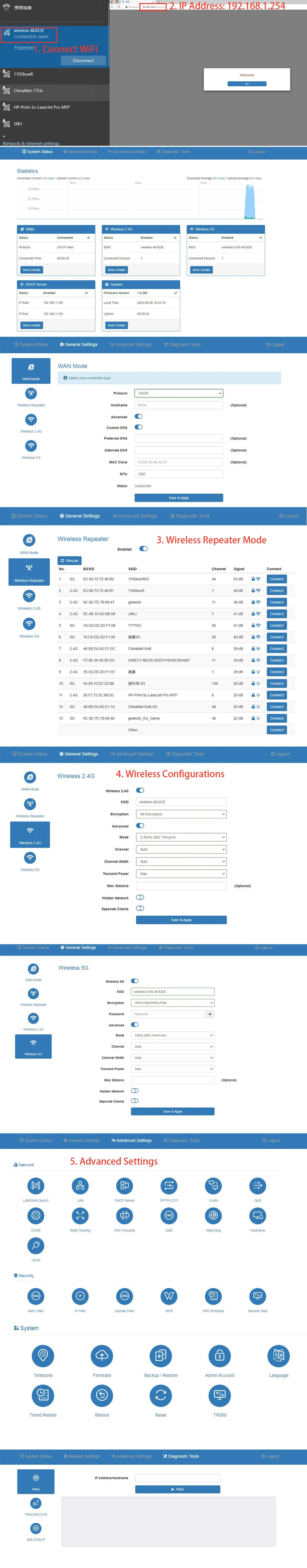 Comply with IEEE 802.11b/g/n/ac Standard, the Wi-Fi data rate is up to 1200Mbps.The AP Router providing 2.4GHz and 5.8GHz dual band wireless wi-fi, 2.4GHz up to 300Mbps access rate, 5GHz up to 866Mbps access rate.