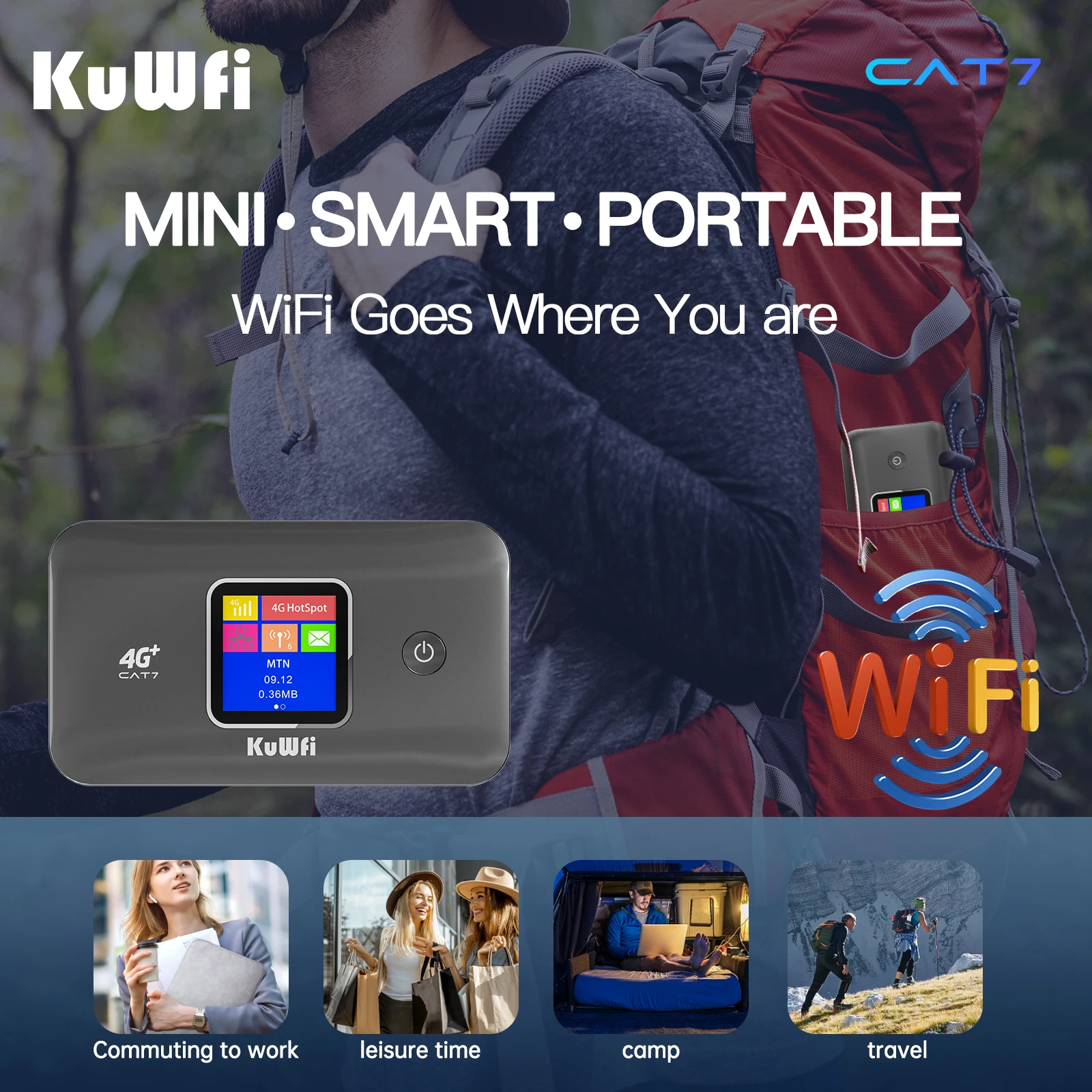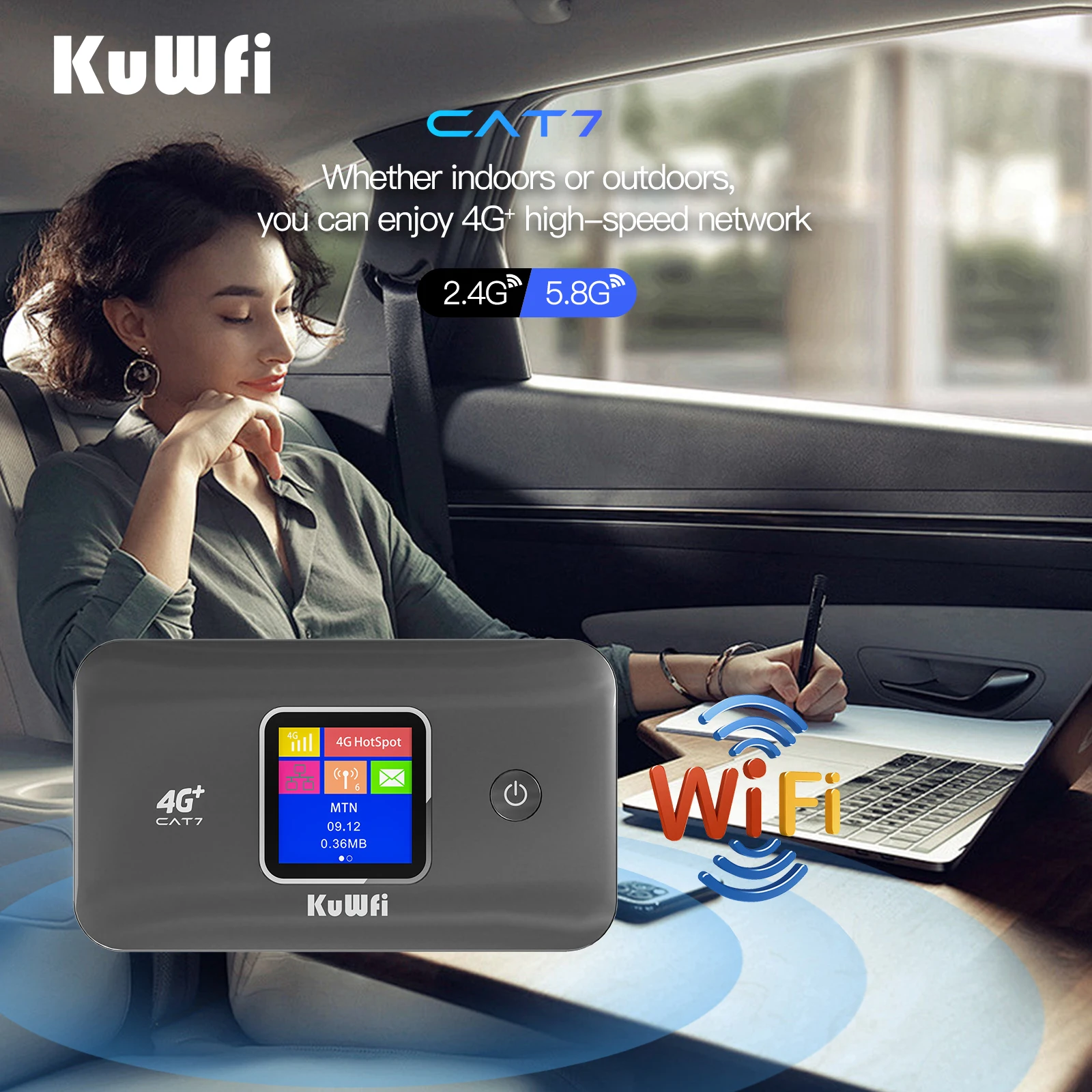 KuWFi MF801 is a CAT7 4G+ portable mobile router.The router comply with IEEE 802.11b/g/n/ac standard, the total Wi-Fi rate up to 1200Mbps. Support 2.4GHz/5GHz Single Wi-Fi,2.4Ghz Wi-Fi rate up to 300Mbps,5GHz Wi-Fi rate up to 866Mbps.With a removable 3000mAh battery and Nano SIM slot.With its portable nature, it allows users to access the Internet anytime and anywhere when user go out on a trip.