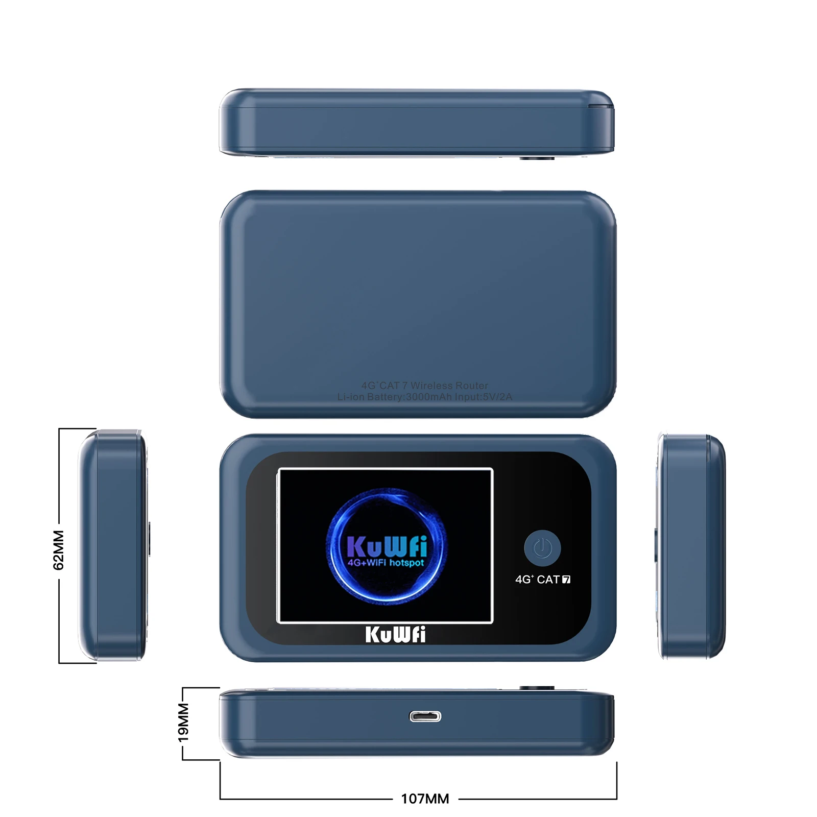 KuWFi C803 is a CAT7 4G+ portable mobile router.The router comply with IEEE 802.11b/g/n/a/ac standard, the total Wi-Fi rate up to 1200Mbps. Support 2.4GHz/5GHz Single Wi-Fi,2.4Ghz Wi-Fi rate up to 300Mbps,5GHz Wi-Fi rate up to 866Mbps.With a removable 3000mAh battery and Mirco SIM slot.With its portable nature, it allows users to access the Internet anytime and anywhere when user go out on a trip.