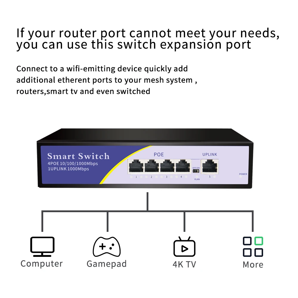 5.PoE switch is ideal for powering PoE devices such as IP cameras, WLAN access point, IP phones, office access control systems, and other PD devices and offers a line of high quality products