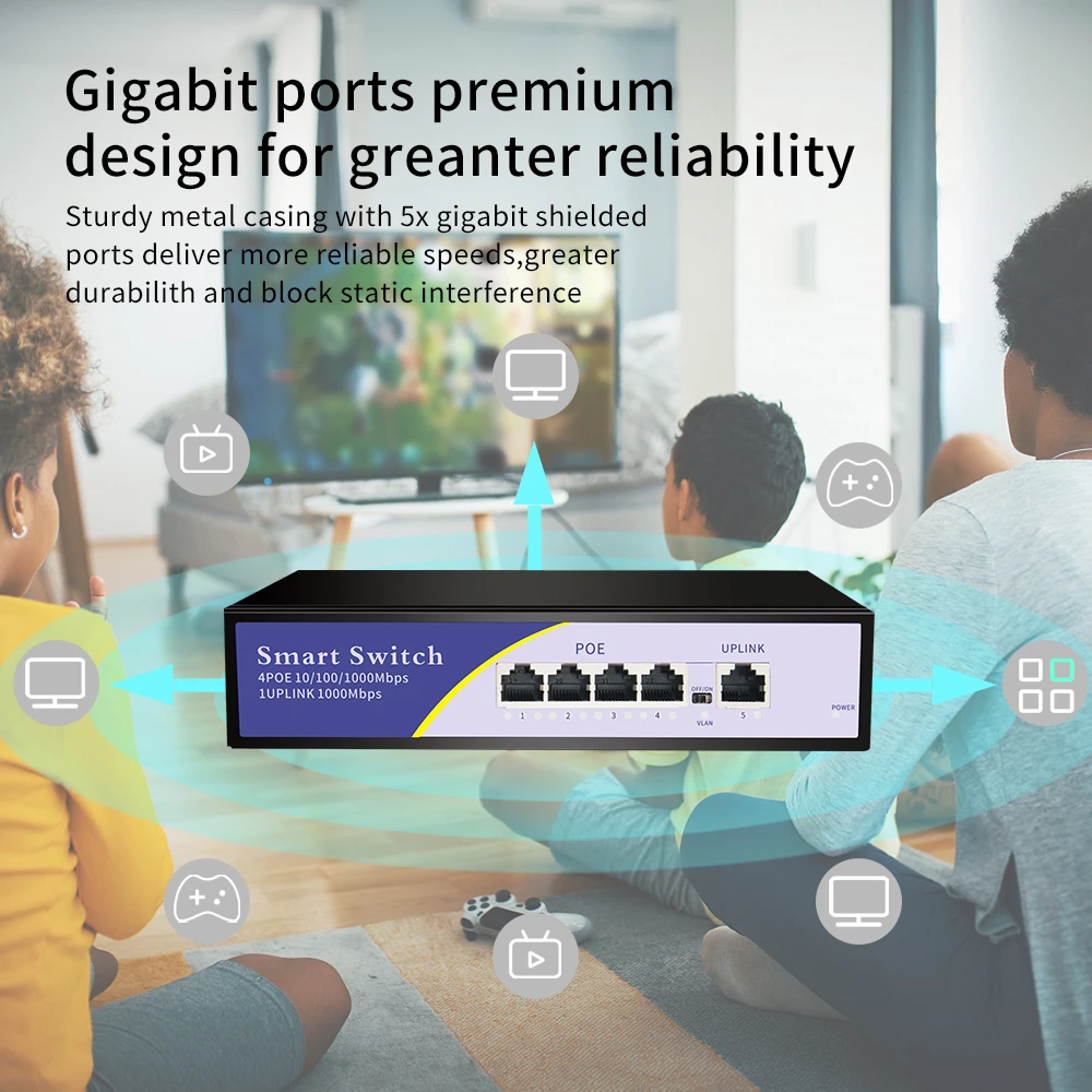 1.4-Port PoE Switch:4 x 10/100/1000 Mbps PoE ports for Security IP Camera Connection +1 x 10/100/1000Mbps fast Ethernet Uplink ports for Router/NVR connection, Plug & Play
