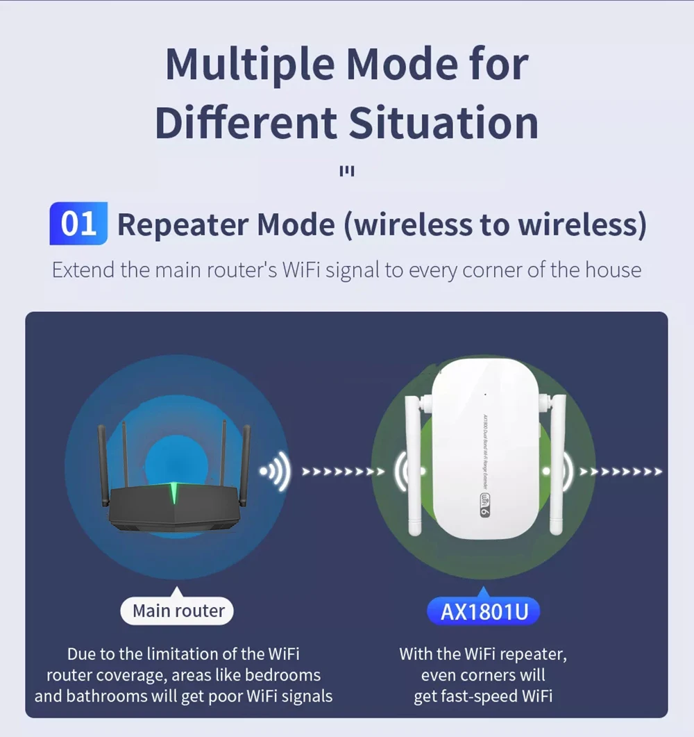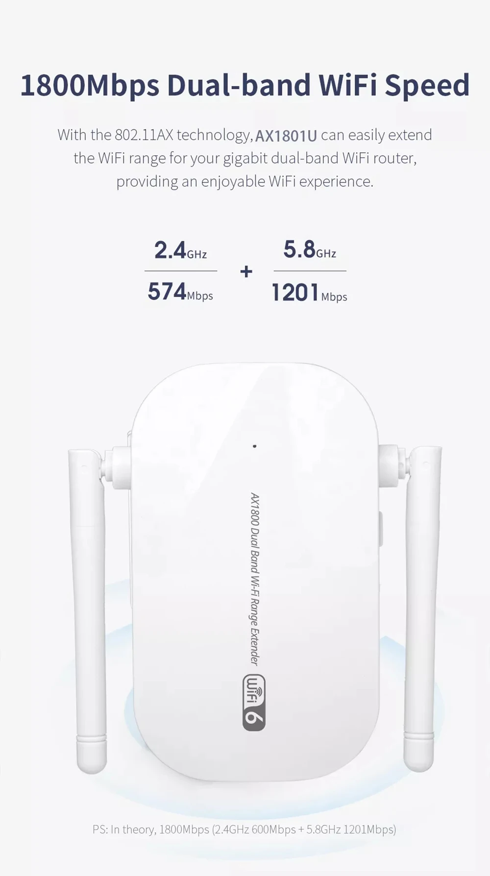 WIFI Extender with latest dual band technology can provide up to 574Mbps for 2.4GHz, up to 1200Mbps for 5Ghz, a total rate of about 1800Mbps, maximizing reduces the loss of data transmission and enjoying HD video/game and fast speeds internet mode.